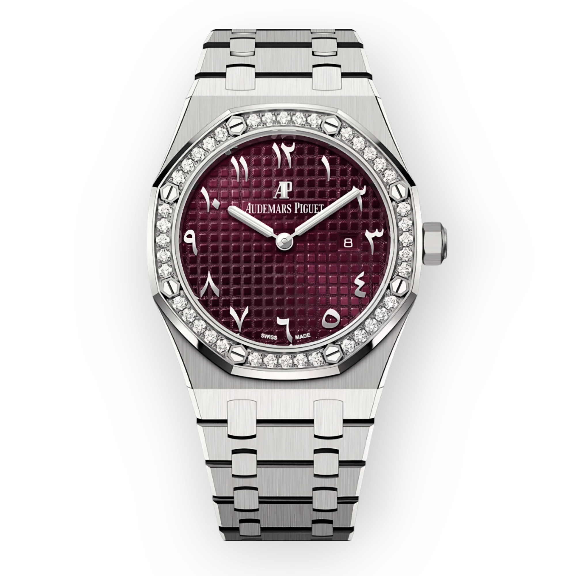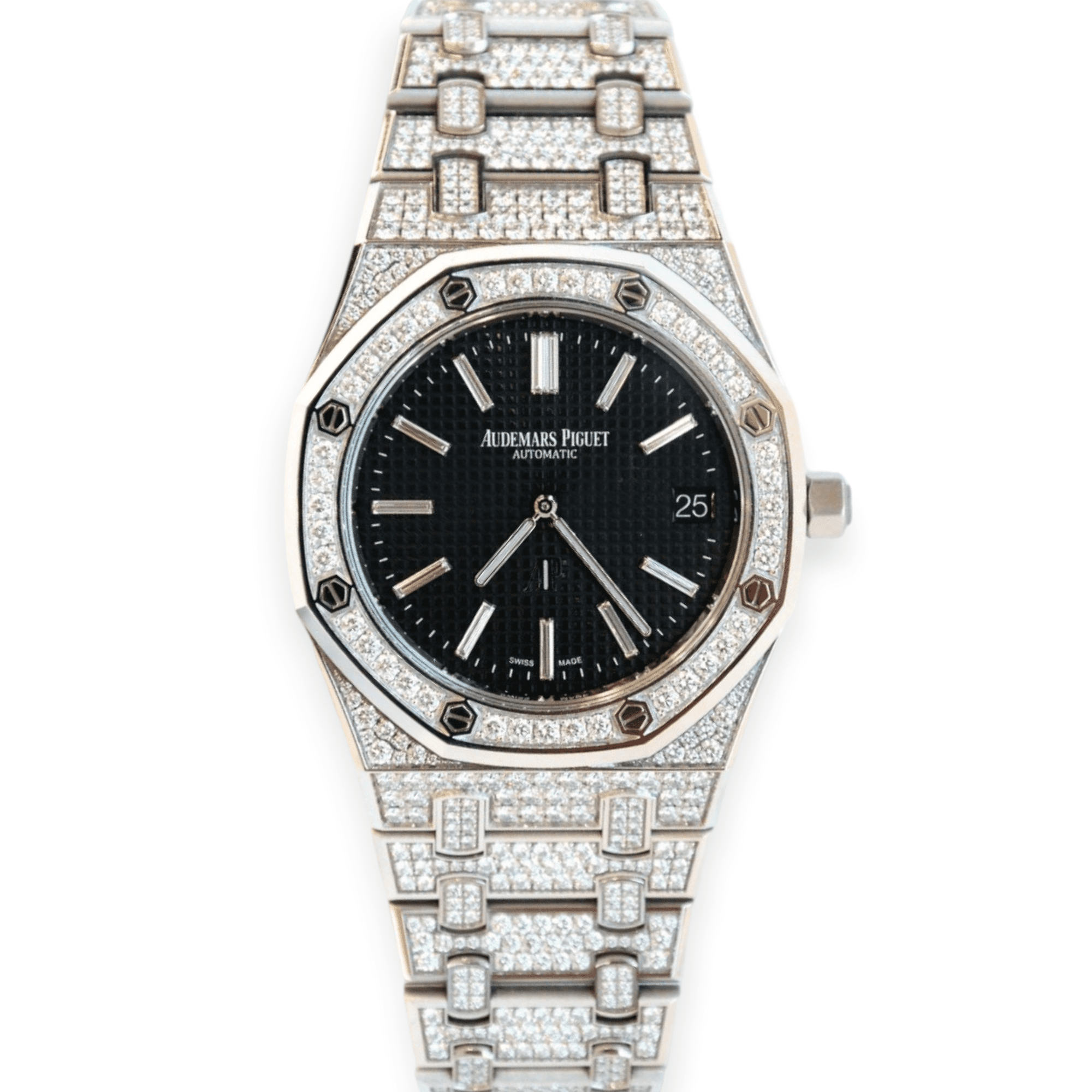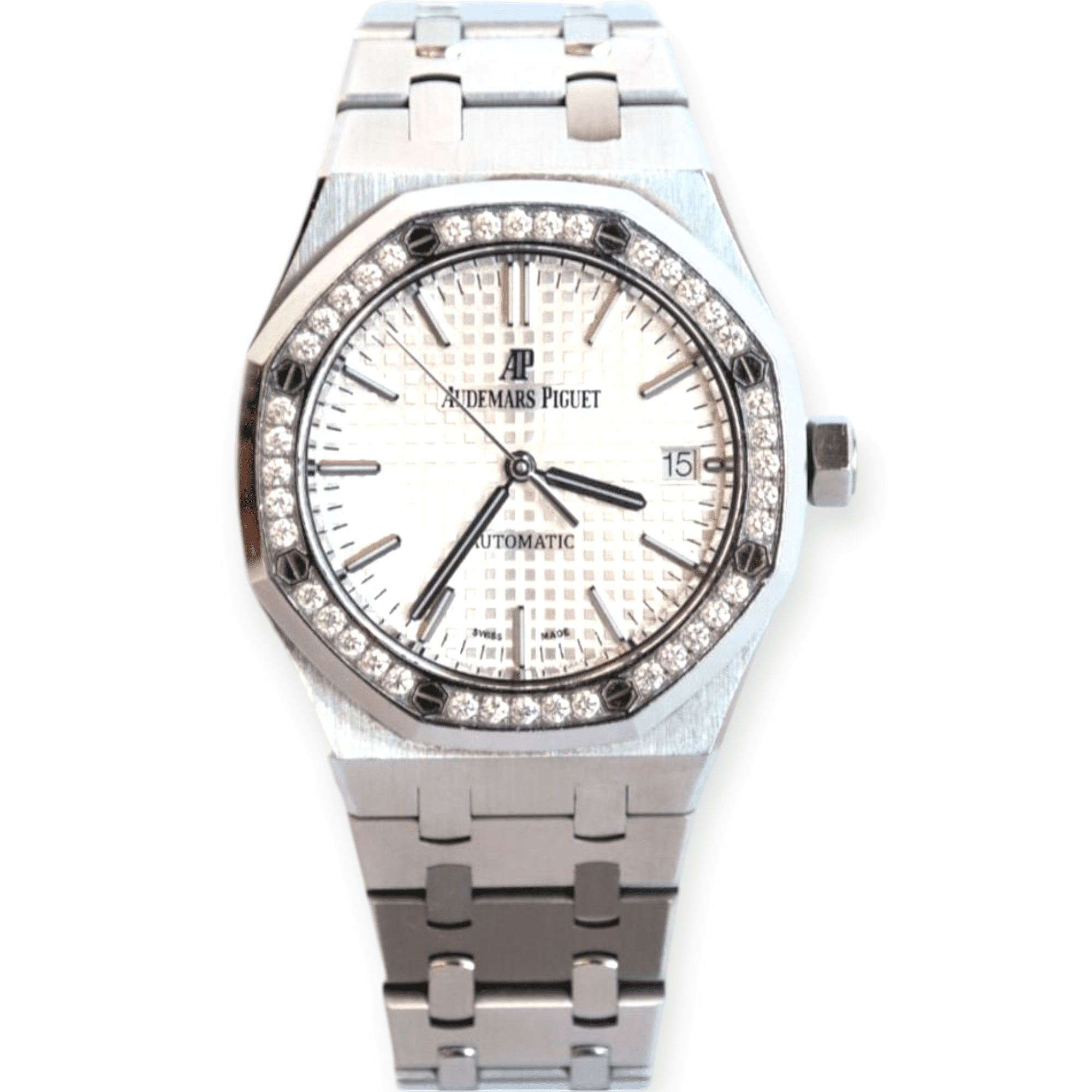 This ladies’ pre-owned timepiece from the Royal Oak collection is larger and bolder with an exquisite diamond-set bezel.
