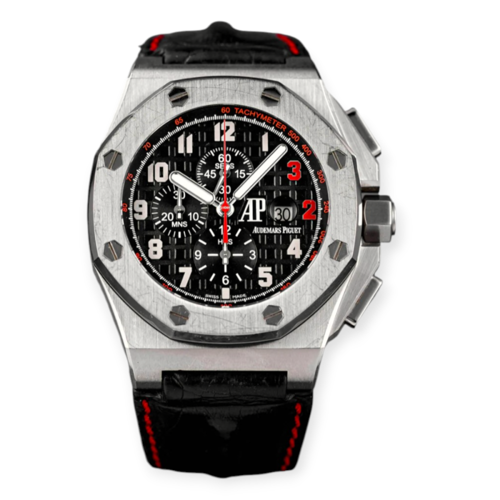 Ideal for those passionate about sports, the Offshore Collection’s timepiece is crafted from stainless steel and ceramic. Featuring a  black aperture dial with red highlights, this piece carries over its luxury aesthetic without compromising on strength or style!