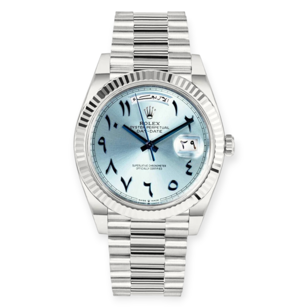 Pre-owned Rolex Day-Date 40mm Ice Blue Arabic Dial Bagu...