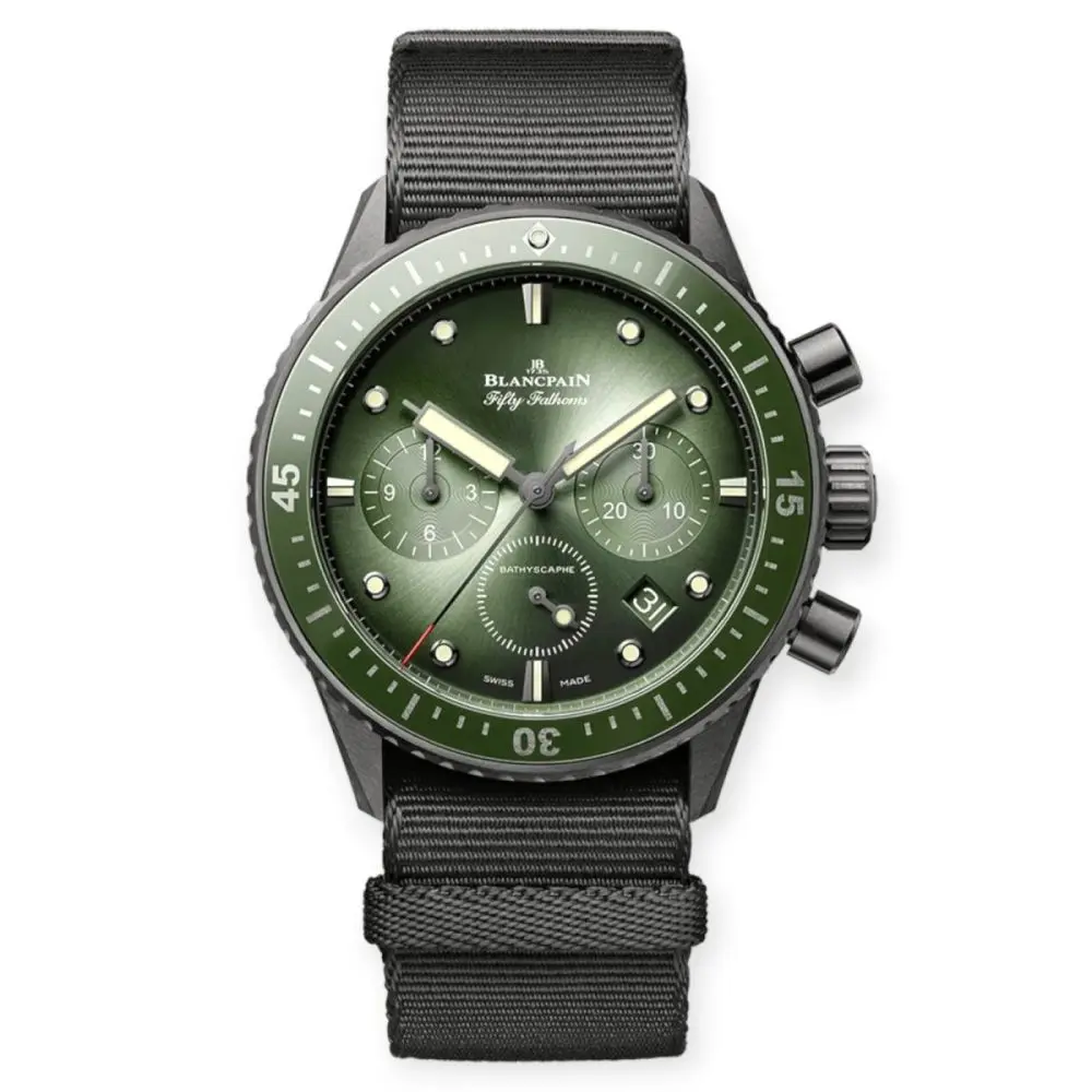 Discover the Blancpain Fifty Fathoms Bathyscaphe Chronograph Flyback 43.6mm Green Dial (Ref. 5200‑0153‑B52A), a luxury dive watch engineered for precision and performance. Crafted in black ceramic and powered by the high‑frequency Blancpain F385 automatic movement, this Bathyscaphe chronograph delivers exceptional accuracy, durability, and style. The vibrant green dial paired with a matching canvas strap makes this model one of the most sought‑after modern Blancpain releases. Ideal for collectors, divers, and enthusiasts seeking a premium Swiss chronograph with flyback functionality.