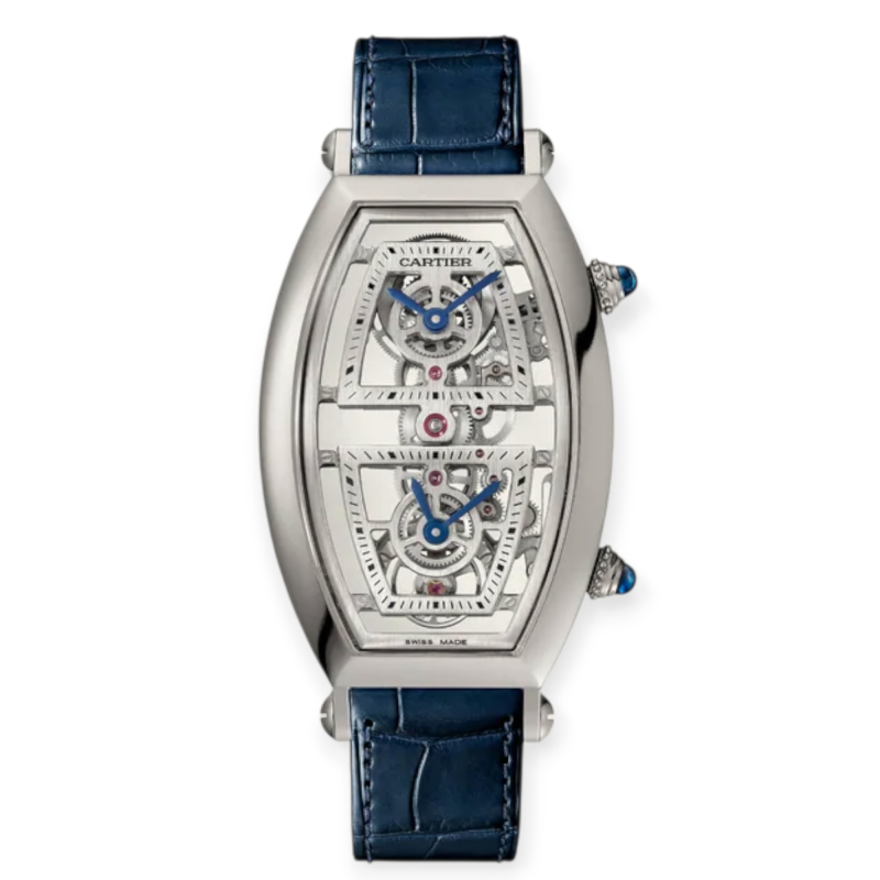 Discover the Cartier Tonneau Skeleton Dual Time XL Ref. WHTN0012, a platinum luxury watch that showcases Cartier’s expertise in shaped cases and skeletonized movements. This high‑end men’s watch features the manual‑winding Cartier 9919 MC calibre, designed specifically to match the curved tonneau case. With a fully openworked dual‑time display, sapphire crystal front and back, and two sapphire‑cabochon crowns, this model blends technical innovation with iconic Cartier aesthetics.