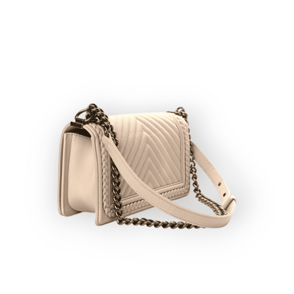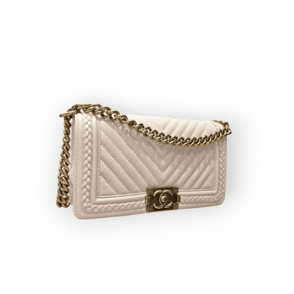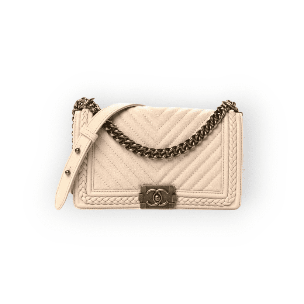 Pre-Owned Chanel Boy Medium Limited Chevron Caviar Braided Quilted Beige Aged Gold