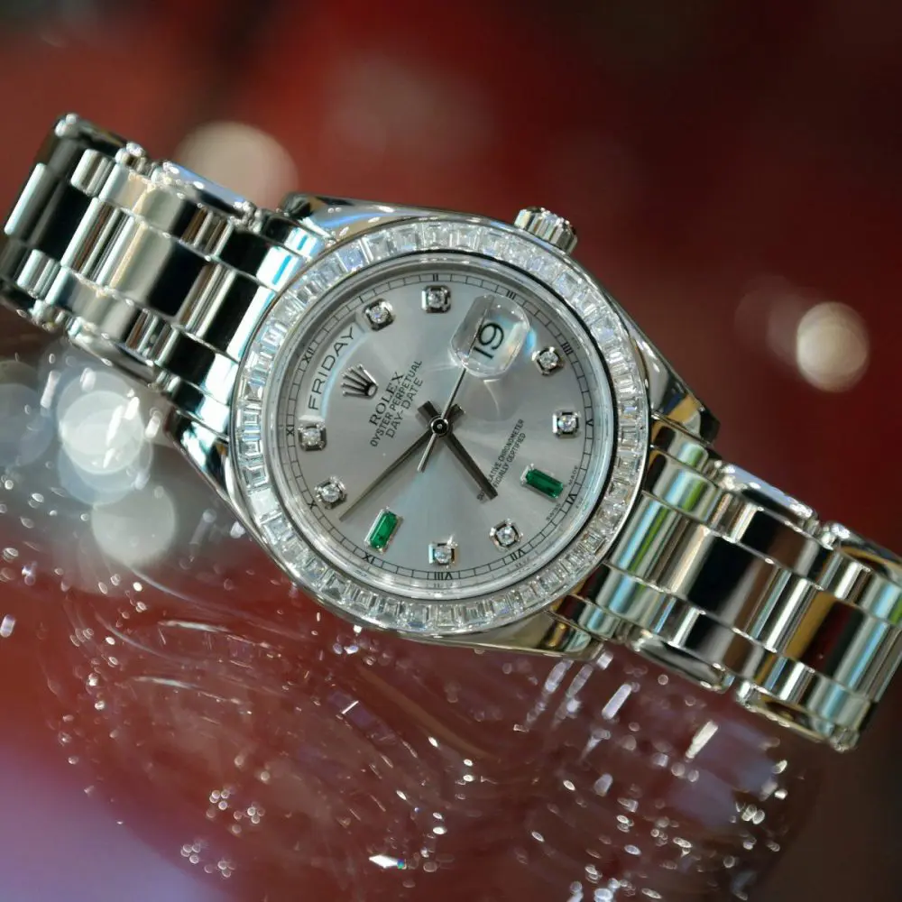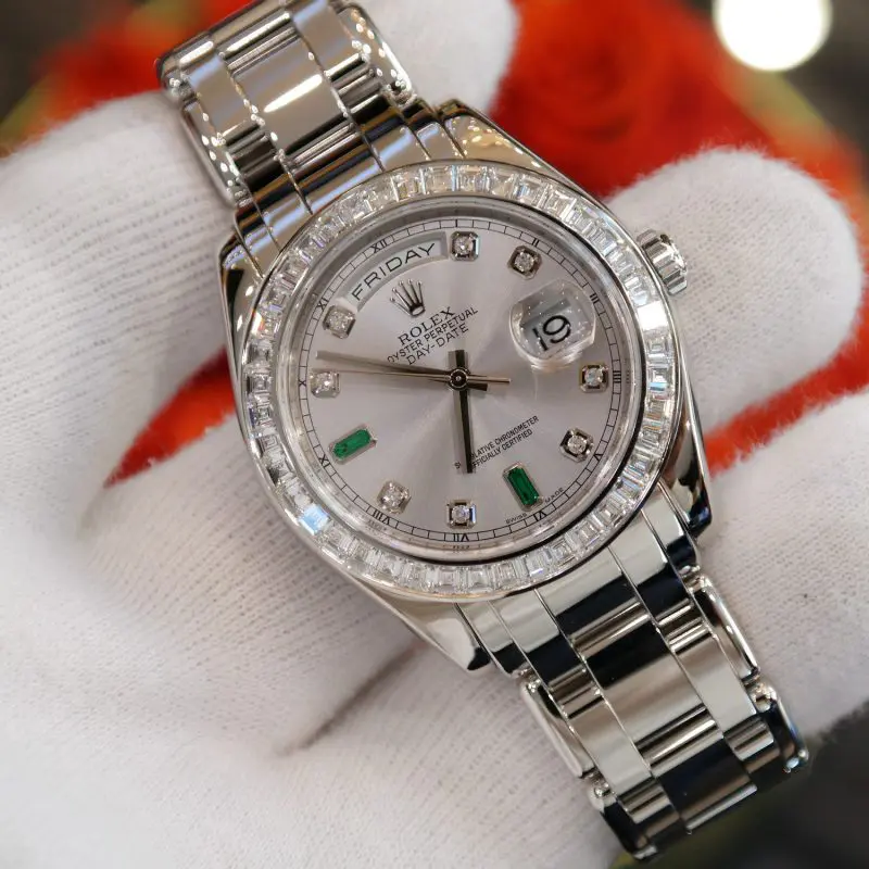 Pre-Owned Rolex Day Date Masterpiece Pearlmaster Platinum 39mm Silver- 6&9 Green Emerald Diamond Dial 18956BR