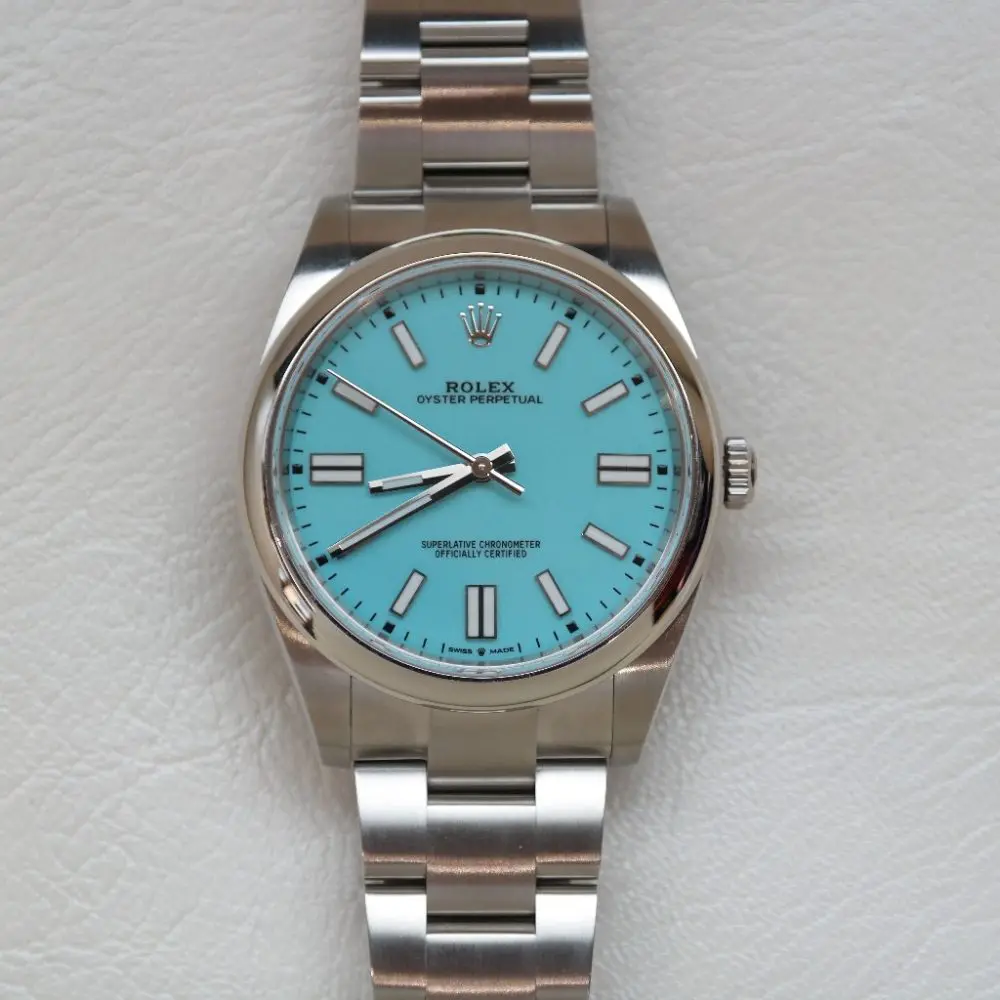 Pre-owned Rolex Oyster Perpetual Steel 41mm Turquoise Blue Index Dial 124300