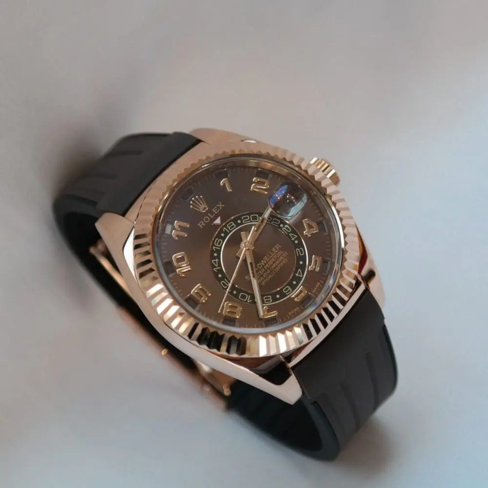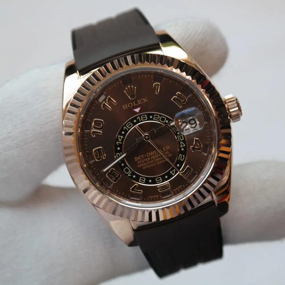 Pre-Owned Rolex Sky-Dweller Rose Gold Chocolate Arabic Dial 42mm Rubber Strap 326135