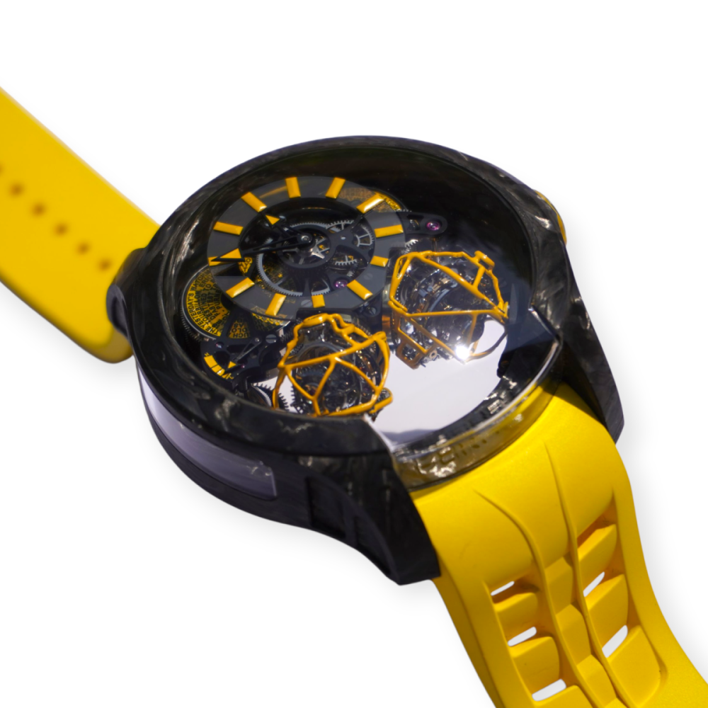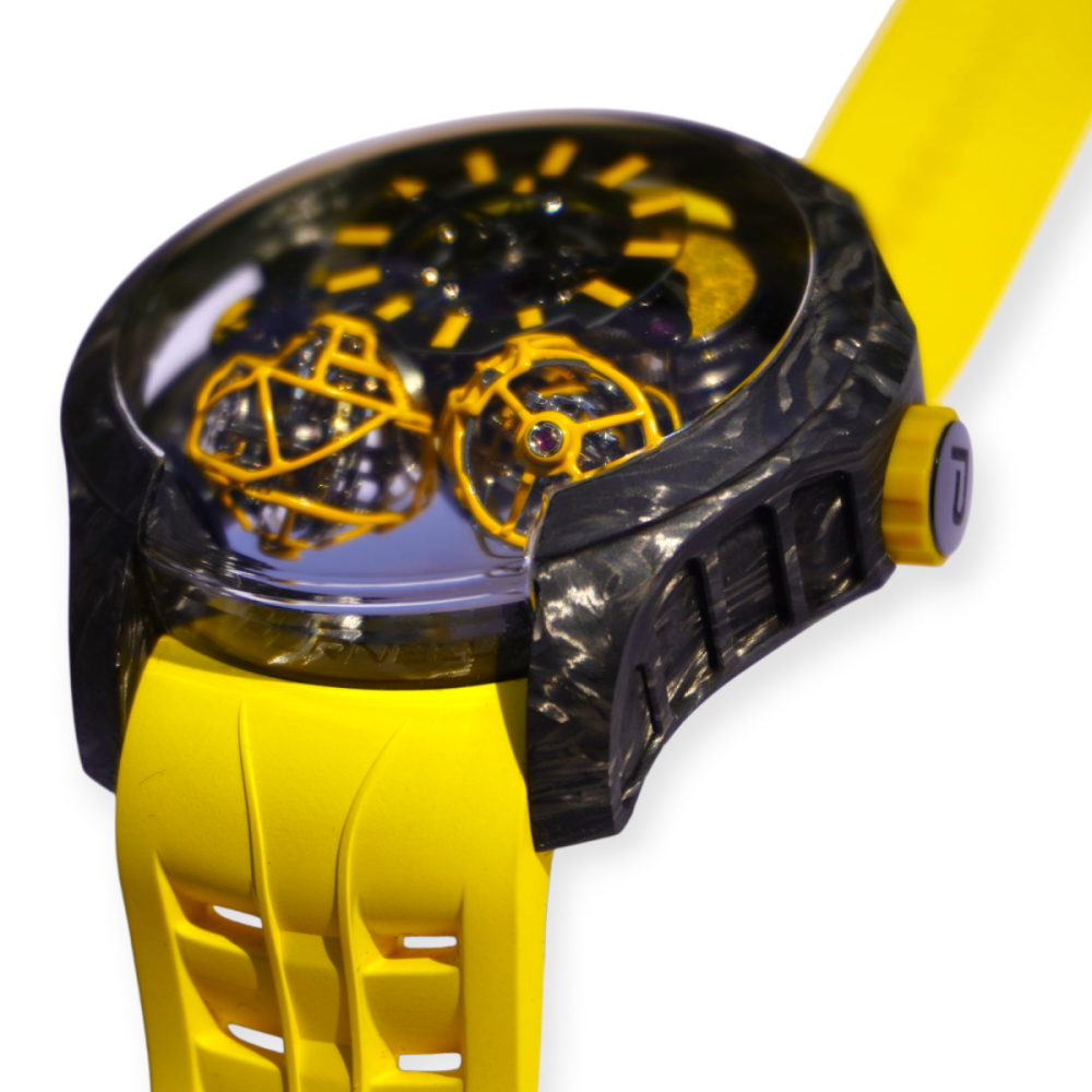 Experience the pinnacle of haute horlogerie with the limited-edition Purnell Escape II Forged Carbon Yellow watch.This exclusive luxury timepiece, reference P03YWCB, is a masterpiece of mechanical innovation, highlighted by its record-breaking triple-axis tourbillon and avant-garde forged carbon construction. With only three pieces in existence, it represents a rare investment in high horology.